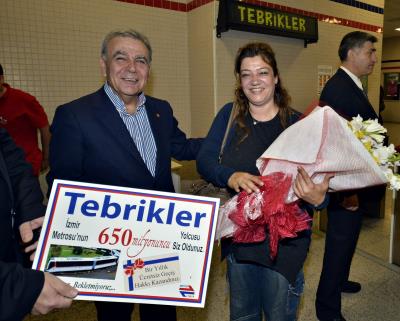 - yılını kutlayan İzmir Metrosu’nun aynı zamanda 650 milyon yolcu sayısına ulaşması nedeniyle Fahrettin Altay İstasyonu’nda sürpriz bir tören düzenlendi. Her şeyden habersiz metroya binmek üzere turnikelerden geçiş yapan ev hanımı İlknur Haşlamacı, bir anda çalan alarmlar, atılan konfetiler ve alkışlar eşliğinde 650 milyonuncu yolcu olduğunu öğrendi. Kısa süreli bir şaşkınlık yaşayan Haşlamacı’ya durumu İzmir Büyükşehir Belediye Başkanı Aziz Kocaoğlu açıkladı. Çok şaşırdığını ve mutlu olduğunu dile getiren talihli yolcunun ödülü ise 1 yıl boyunca İzmir Metrosu’ndan ücretsiz yararlanma hakkı oldu. Başkan Aziz Kocaoğlu, Haşlamacı’ya ödülünü vererek, hayırlı olmasını diledi.