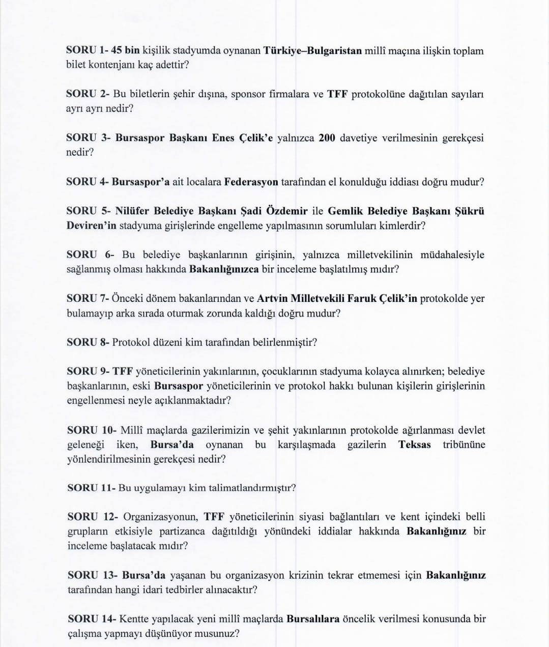 Türkoğlu’nun Bakan’dan cevaplamasını istediği sorular arasında; bilet kontenjanlarının kimlere ne kadar verildiği, protokol listelerinin nasıl oluşturulduğu, belediye başkanlarının engellenmesinin sorumluları, gazilerin neden tribüne yönlendirildiği ve Bursa’ya yönelik bu haksızlığın nasıl telafi edileceği gibi kritik başlıklar yer aldı.