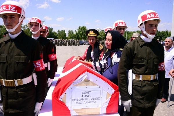 Şehit Binbaşı Arslan Kulaksız’ın bayrağa sarılı naaşı, hazırlanan katafalka konulurken, saldırıda yaralanan kolu askıya alınan eşi Sibel ile 15 yaşındaki kızı İren de törene katıldı. Şehit Binbaşı Kulaksız’ın İstanbul’da üniversite öğrencisi olan 22 yaşındaki oğlu Dursun Burak, babasının toprağa verileceği Amasya’ya gittiği için buradaki törene katılamadı.
