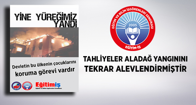 Adana’nın Aladağ ilçesinde cemaat yurdunda çıkan ve 11’i kız öğrenci ve bir görevli olmak üzere 12 kişinin hayatını kaybettiği yangınla ilgili davada mahkemece, tutuklu dört sanık hakkında tahliye kararı verilmesi, Eğitim İş Sendikası tarafından üzüntü ile karşılandı.