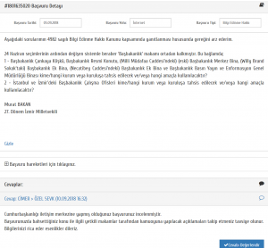 Milletvekiline ‘tavsiye’ veren CİMER, verdiği yanıtta “Başvurunuzda bahsettiğiniz konu ile ilgili yetkili makamlar tarafından kamuoyuna yapılacak açıklamaları takip etmeniz tavsiye olunur” ifadelerini kullandı.