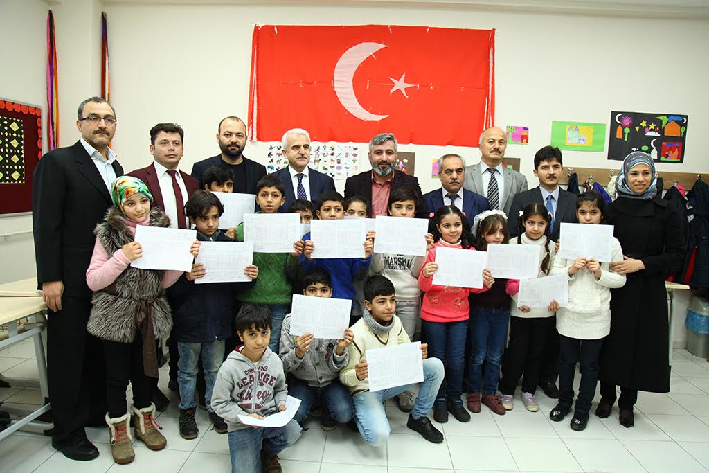 Sakarya Büyükşehir Belediyesi Karaman Geçici Eğitim Merkezi’nde ilk karne heyecanı yaşandı. Çocukların mutluluğunu paylaşmak için merkezi ziyaret eden İl Milli Eğitim Müdürü Mevlüt Kuntoğlu, Kültür ve Sosyal İşler Dairesi Başkanı İbrahim Aktürk, İHH İnsani Yardım Vakfı Sakarya İl Başkanı Sebahattin Aydın, Yaygın Eğitim Şube Müdürü Halide Kama ve İl Milli Eğitim Müdürlüğü Teftiş Kurulu üyeleri sığınmacı öğrencilere karnelerini takdim ettiler. Programda öğrenciler tarafından hazırlanan dönem sonu etkinliği ise büyük alkış topladı.