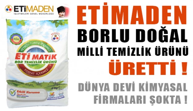 Eti Maden İşletmeleri, tamamen doğal maddelerden bor, sabun ve soda ile ürettiği temizlik malzemesi ETİMATİK ile piyasaya hızlı bir giriş yaptı. Ürün raflarda yerini alırken dünya devi deterjan firmaları ise şoke oldu.