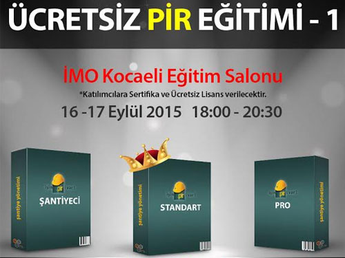 ücretsiz pirİnşaat Mühendisleri Odası (İMO) Kocaeli Şubesi ile YSM Yazılım’ın ortaklaşa düzenlediği etkinlikle; ücretsiz PİR Şantiye Yönetimi Yazılımı Eğitimi’ne katılan kuruluşlara 6 aylık 1 kullanıcılık ücretsiz yazılım lisansı ve katılımcılara PİR Eğitim Sertifikası verilecek. Ayrıca İMO Kocaeli Şube Yöneticileri iş birliği ile ek kullanıcılar ve modüller için %20 lisans indirimi sağlanacak.