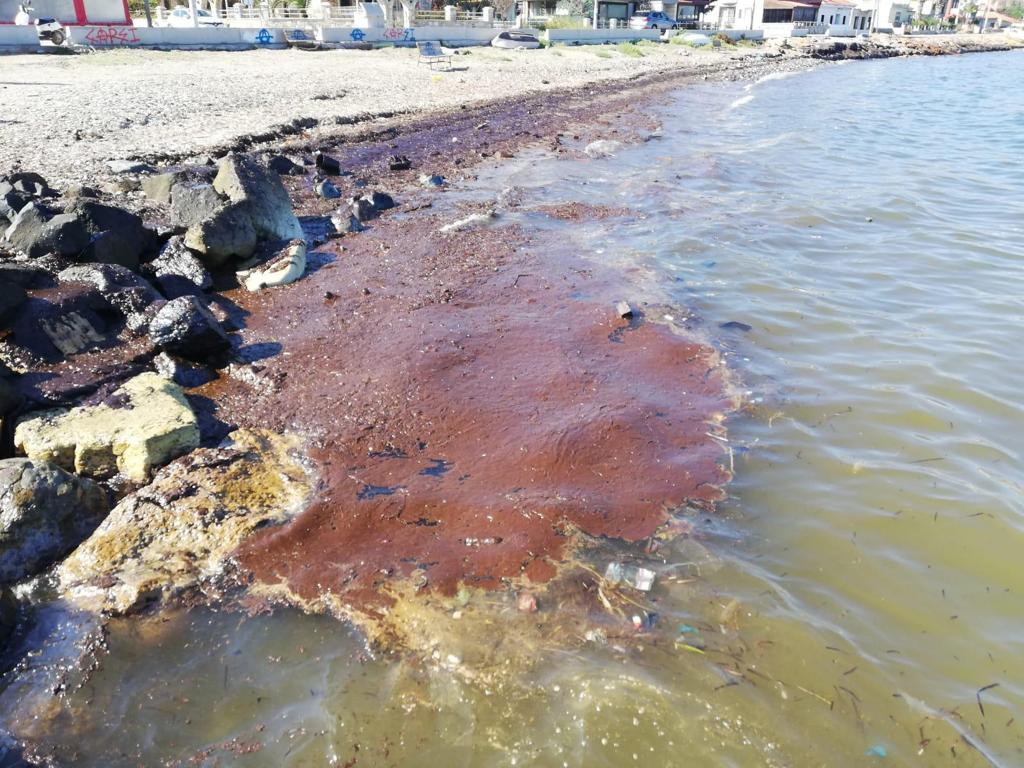 İzmir’in Foça ilçesi Gencelli Körfezi açıklarında denizin üzerini kaplayan koyu kahve renkli yağ tabakası sahile vurdu.