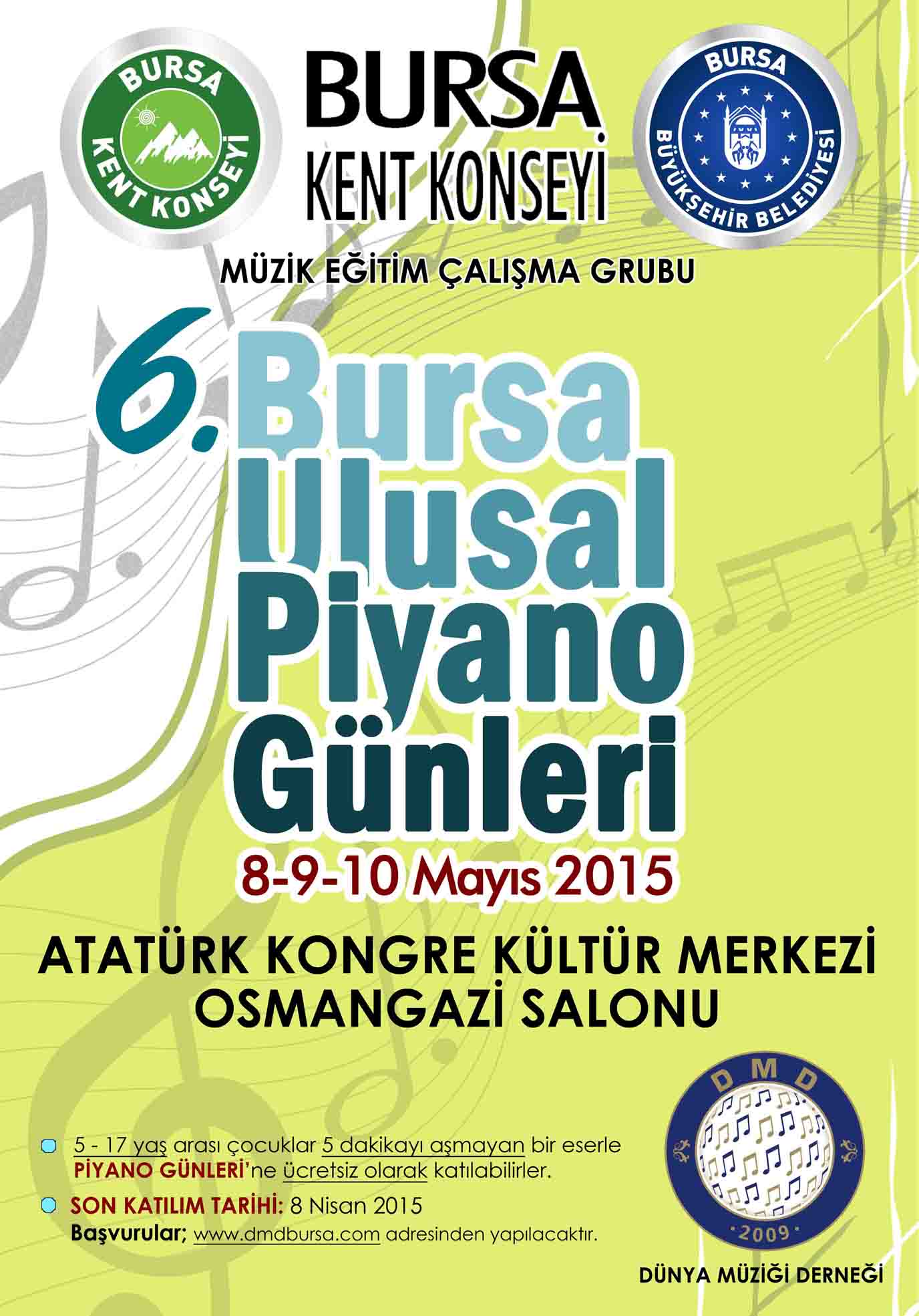 Bursa Kent Konseyi (BKK) Müzik Eğitim Çalışma Grubu’nun Dünya Müzik Derneği (DMD) işbirliğiyle bu yıl 6.’sü düzenlenen ‘Bursa Ulusal Piyano Günleri’nde yüzlerce minik piyanist 3 gün boyunca yeteneklerini sergileyecek.