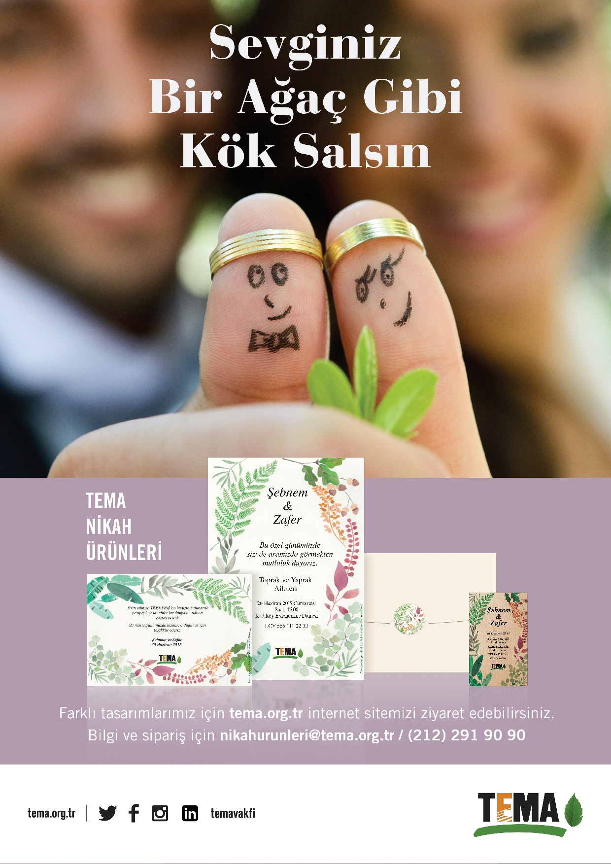 TEMA Vakfı; davetiye, nikah kartı ve ahşap magnet gibi ürünlerden oluşan TEMA Nikah Ürünleri’ni çiftlerin beğenisine sunuyor. TEMA Nikah Ürünleri’nin çiçekler, yapraklar, lale, kuşlar ve orman gibi çeşitleri bulunuyor. Ürünlerde kullanılan ağaç malzemenin tamamı sürdürülebilir orman yönetim ilkelerine göre yönetilen FSC sertifikasına sahip ormanlardan geliyor. FSC sertifikasına sahip ormanlarda ekosistem bütünlüğü, ağaç varlığı ve biyolojik çeşitlilik korunuyor.