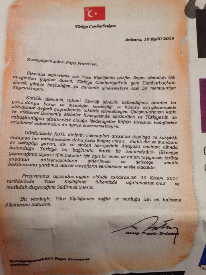 Cumhurbaşkanı Erdoğan’ın 10 Eylül 2014 tarihinde Papa’ya yazdığı ileri sürülen mektupta “Kutsiyetpenahları Papa Fransuva, ülkemizi ziyaretiniz için Yüce Kişiliğinize selefim Sayın Abdullah Gül tarafından yapılan daveti, Türkiye Cumhuriyeti’nin yeni Cumhurbaşkanı olarak göreve başladığım şu günlerde yinelemekten özel bir memnuniyet duymaktayım” ifadeleri kullanılmıştı.