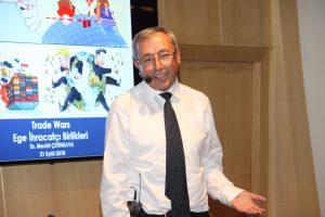Amerika Birleşik Devletleri Başkanı Donald Trump’ın Çin, Rusya, Türkiye başta olmak üzere birçok ülkeyi etkileyen ve ticaret savaşları olarak nitelendirilen koruma önlemleri ile ilgili bir sunum yapan Ege Demir ve Demirdışı Metaller İhracatçıları Birliği Yönetim Kurulu Üyesi Dr. Mevlüt Çetinkaya, düne kadar ticarette serbestleşmeyi, globalleşmeyi savunan ABD’nin koruma önlemleri isteyen konuma geldiğini, ticarette sınırlama isteyen Çin’in ise serbestleşme talep eden pozisyona geçtiğini kaydetti.