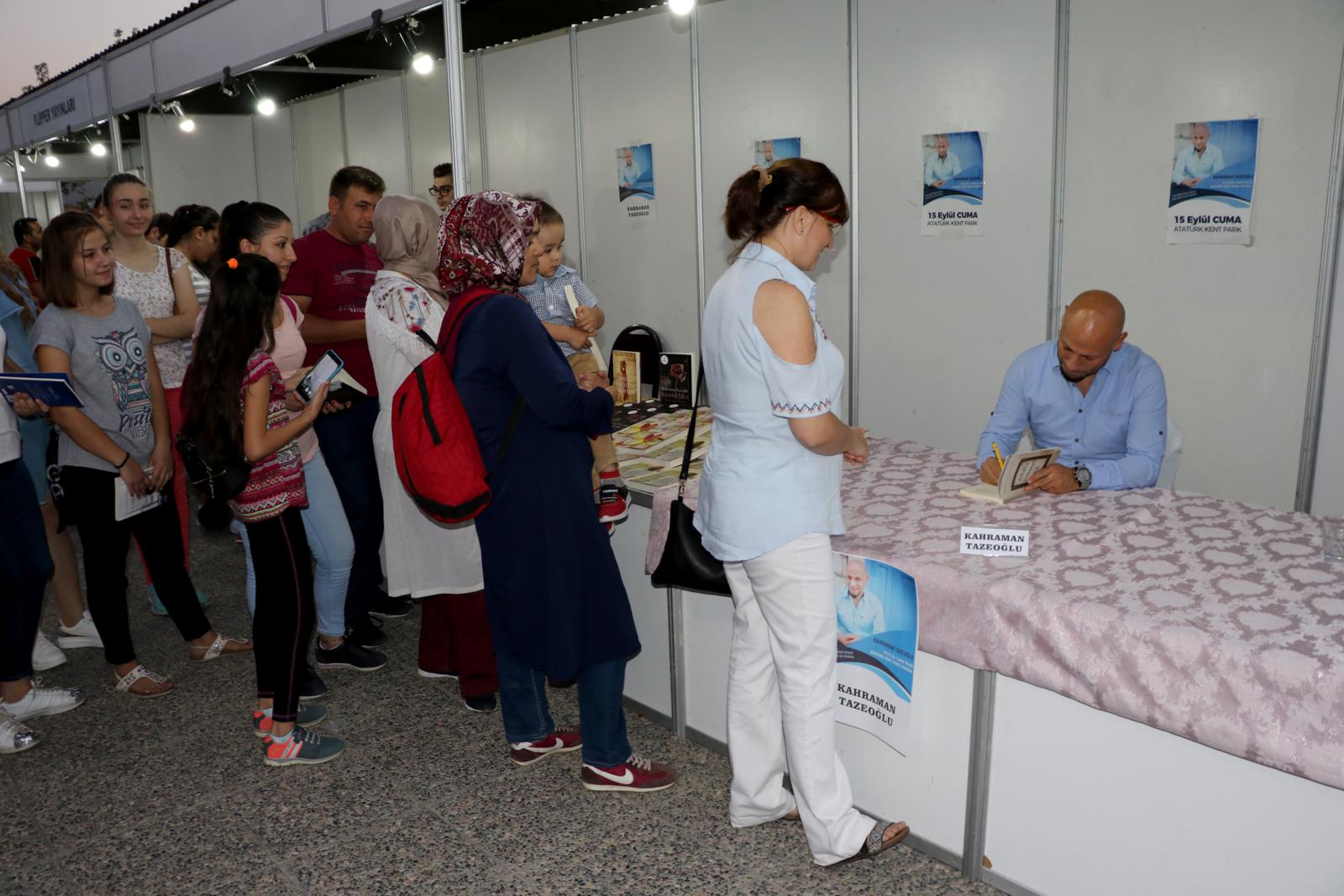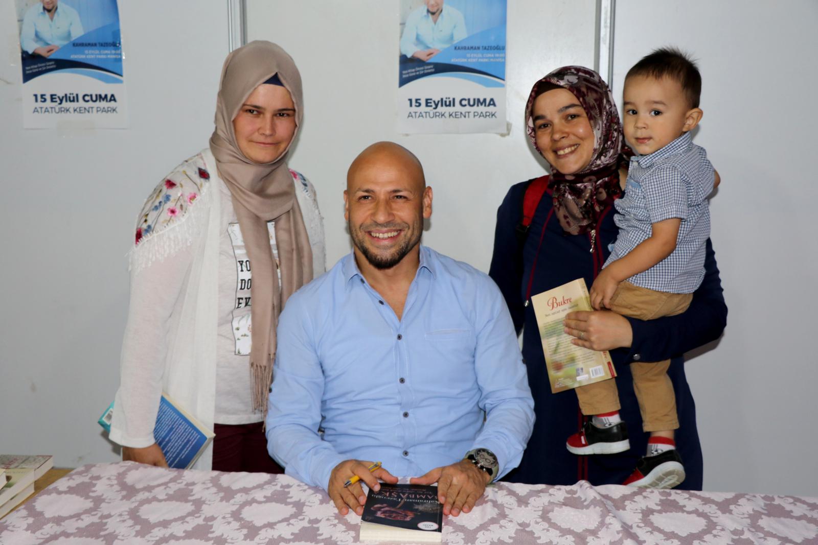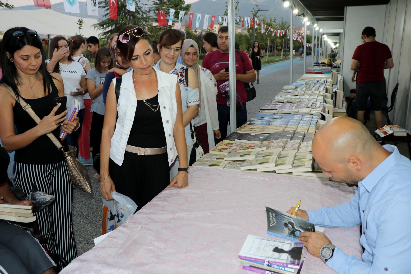 Manisa Büyükşehir Belediyesi tarafından Atatürk Kent Park’ta düzenlenen ‘Kitap Günleri’ çok sayıda yayınevi ve ünlü yazarı ağırlıyor. Düzenlenen etkinlikler kapsamında sevilen yazar Kahraman Tazeoğlu, okurlarıyla bir araya geldi. Ünlü yazar Kahraman Tazeoğlu, buluşmada kitaplarını imzaladı, okurlarıyla bol bol hatıra fotoğrafı çektirdi.Kahraman Tazeoğlu Manisa’da Okurlarıyla Buluştu (5)_1600x1067
