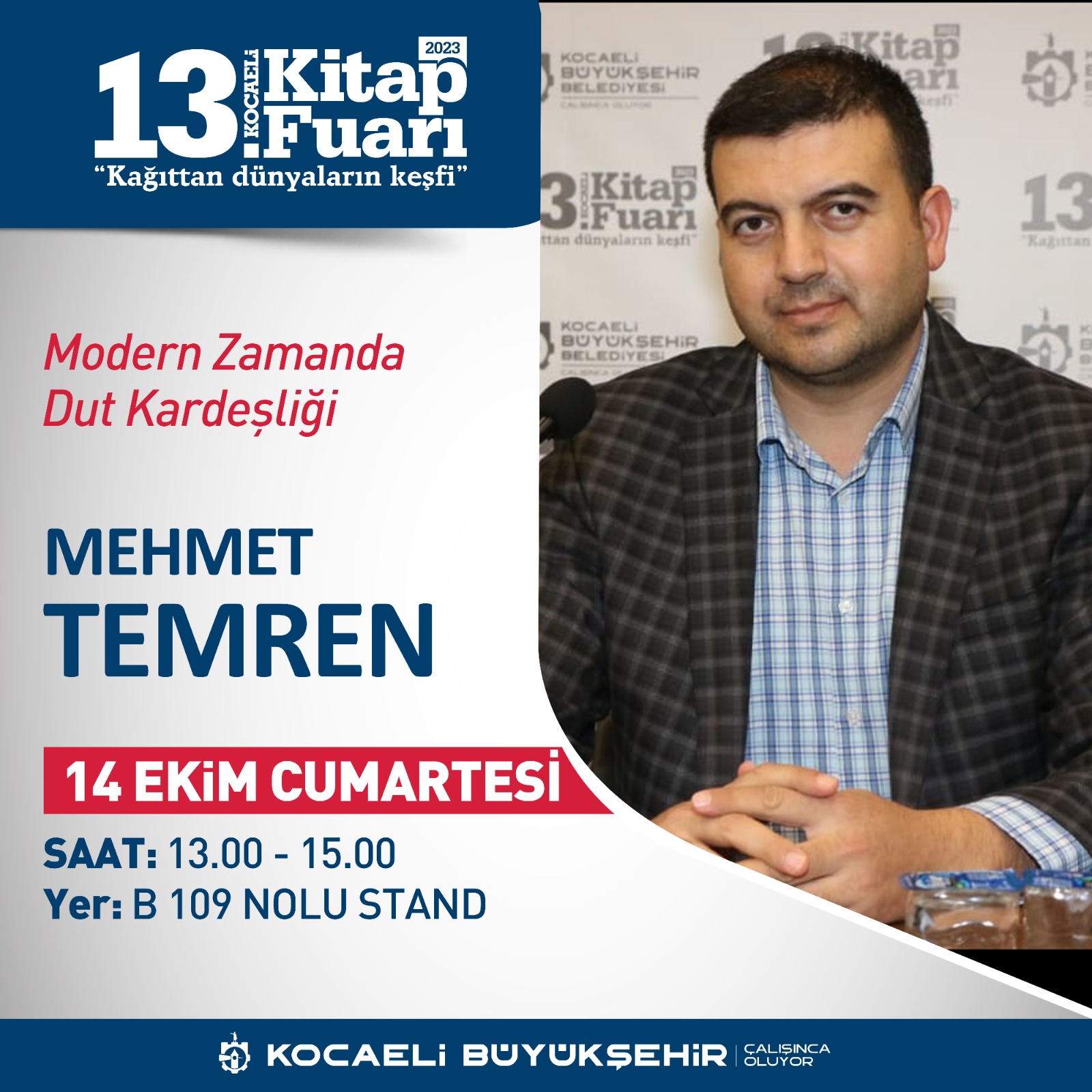 Dut Kardeşliği Yazarı Sosyolog Mehmet Temren, 14 Ekim Cumartesi günü Kocaeli Kitap Fuarında düzenleyeceği İmza gününde elde edeceği geliri, Filistin de yaşanan zulme karşı duruş sergilemek maksadıyla elde edeceği gelirin tamamını bağışlayacak.