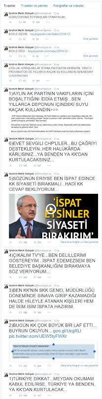 Twitter hesabından Kılıçdaroğlu’na seslenen Başkan Gökçek, “Türkiye dikkat… Meydan okumam kabul edilirse, Türkiye ya benden ya KK’dan kurtulacak” mesajı attı. Kılıçdaroğlu’nun, “İspat etsinler, siyaseti bırakırım” sözlerinin yer aldığı açıklamasına ilişkin haberleri de takipçileriyle paylaşan Başkan Gökçek, şu twittleri attı: