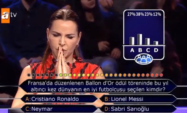 Yarışmacı seyircilerin aksine B şıkkı Lionel Messi şıkkını işaretledi. Doğru cevabın B şıkkı Lionel Messi’nin olduğu soru sosyal medyada da oldukça ses getirdi.
