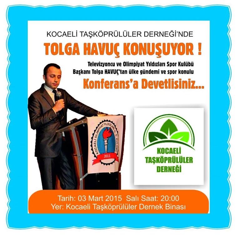 Yasin Sönmez Başkanlığındaki Kocaeli Taşköprülüler Derneğinde TV Program Yapımcısı ve Kocaeli Olimpiyat Yıldızları Jimnastik Kulübü Başkanı Tolga Havuç konferans verecek.