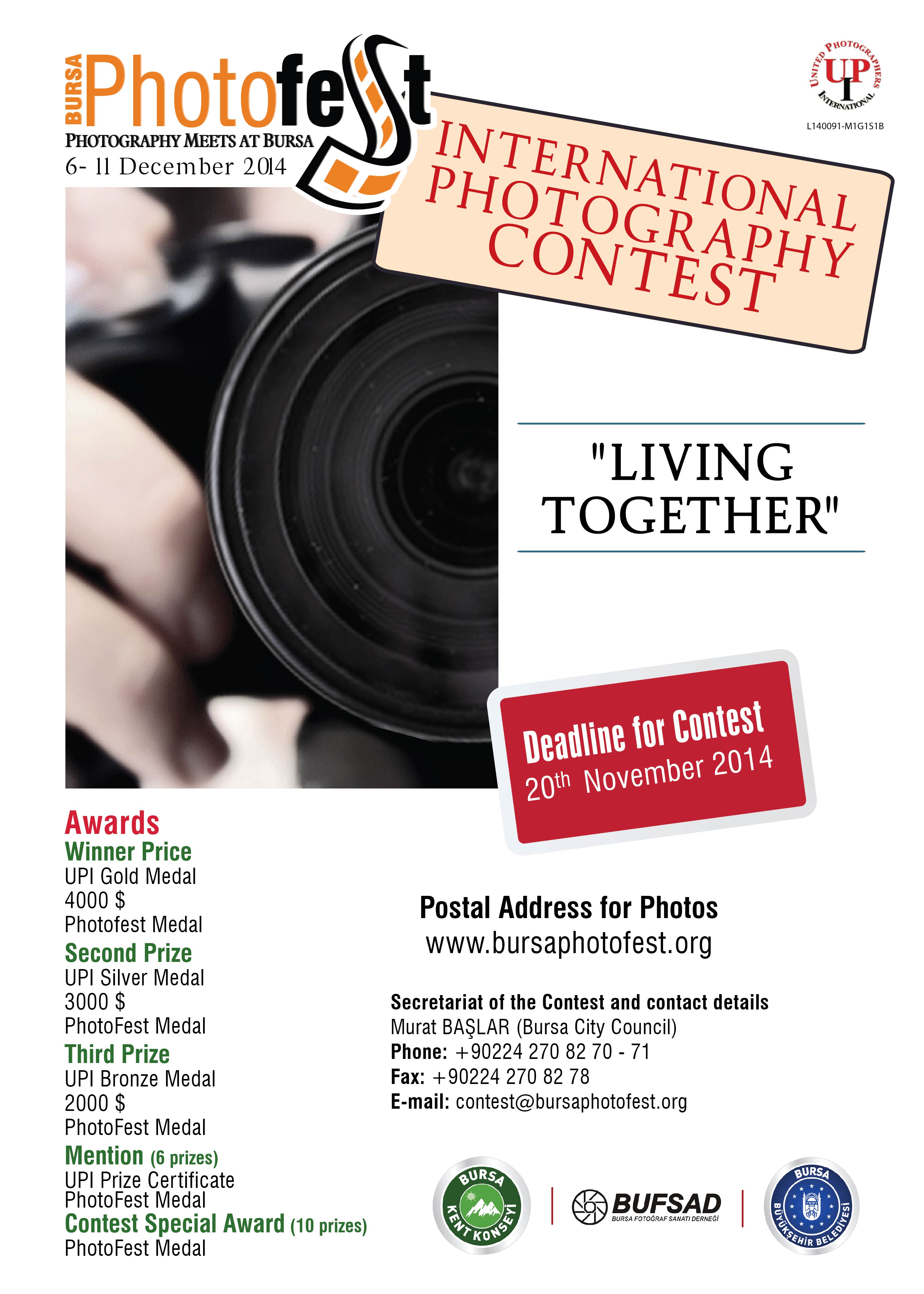 Bursa Büyükşehir Belediyesi, Bursa Kent Konseyi (BKK) ve BUFSAD işbirliğiyle bu yıl 4.’sü düzenlenen 4. Uluslararası Bursa Fotoğraf Festivali (BursaFotoFest) kapsamında ‘Birlikte Yaşamak’ temalı fotoğraf yarışması düzenleniyor. Fotoğraf tutkunlarının www.bursaphotofest.org adresi üzerinden dijital olarak katıldığı uluslararası fotoğraf yarışmasına 39 ülkeden ve Türkiye’nin 57 kentinden bin166 başvuru yapıldı. 3862 fotoğrafın geldiği yarışmanın patronaj numarası ‘United Photographers International’ (UPI) tarafından veriliyor. Seçici kurul toplantısı 29 Kasım Cumartesi günü yapılacak. Yarışmanın jüri üyeliklerini ise Prof. Dr. Sabit Kalfagil, Öğr. Gör. Kamil Fırat, Dr. Ceyhun İrgil, Neslişah Hanzade Erbey Kuşku, Öğr. Gör. Alper Bilsel, Bülent Suberk ve Öğr. Gör. Mustafa Bilge Satkın yapıyor. .