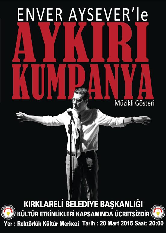 Yakın geçmişimizi şekillendiren sosyal ve siyasal olayları şiirle, edebiyatla, müzikle ve kayda geçmiş görüntülerle canlı bir belgesel tadında sahneye taşıyan Enver Aysever ‘’Aykırı Kumpanya’’ adlı gösterisi ile Kırklareli’ne geliyor.