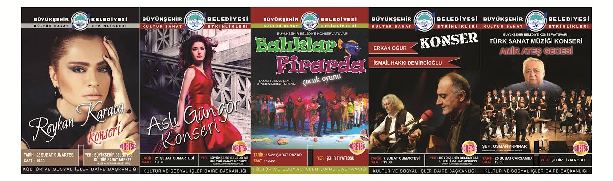 Büyükşehir Belediyesi’nin Şubat ayı etkinliklerinde altı konser yer alıyor. 7 Şubat Cumartesi günü Erkan Oğur ile İsmail Hakkı Demircioğlu Büyükşehir Belediyesi Kültür Sanat Merkezi’nde sahne alacak. 12 Şubat Perşembe günü Nusret Yılmaz’ın katılacağı Türk Sanat Müziği konserinin yer alacağı Şubat ayı etkinliklerinde, 17 Şubat Salı günü Büyükşehir Belediyesi Konservatuvarı Türk Halk Müziği konseri verecek. 21 Şubat Cumartesi günü Aslı Güngör’ün konuk sanatçı olarak katılacağı Büyükşehir Belediyesi konserler dizisi 27 Şubat Cuma günü “Amir Ateş” gecesi, 28 Şubat Cumartesi günü ise Reyhan Karaca konseri ile devam edecek.