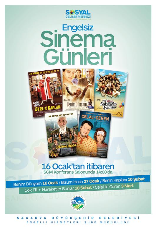 Sakarya Büyükşehir Belediyesi Sosyal Hizmetler Dairesi Başkanlığı Engelli Hizmetleri Şube Müdürlüğü tarafından başlatılan Engelsiz Sinema Günleri’nde ilk gösterim gerçekleştirildi. Sosyal Gelişim Merkezi’nde düzenlenen programda aileleri ile birlikte ‘Benim Dünyam’ filmini izleyen engelli vatandaşlar, keyifli bir gün geçirdi. Sosyal Hizmetler Dairesi Başkanlığı’ndan yapılan açıklamada, Engelsiz Sinema Günleri’nin 27 Ocak Salı günü gerçekleştirilecek ‘Bizum Hoca’ filmi gösterimi ile devam edeceği belirtilerek, etkinlik ile ilgili ayrıntılı bilgi almak isteyen vatandaşların 281 88 05 numaralı telefonu arayabilecekleri ifade edildi.engelsiz sinema.jpg1