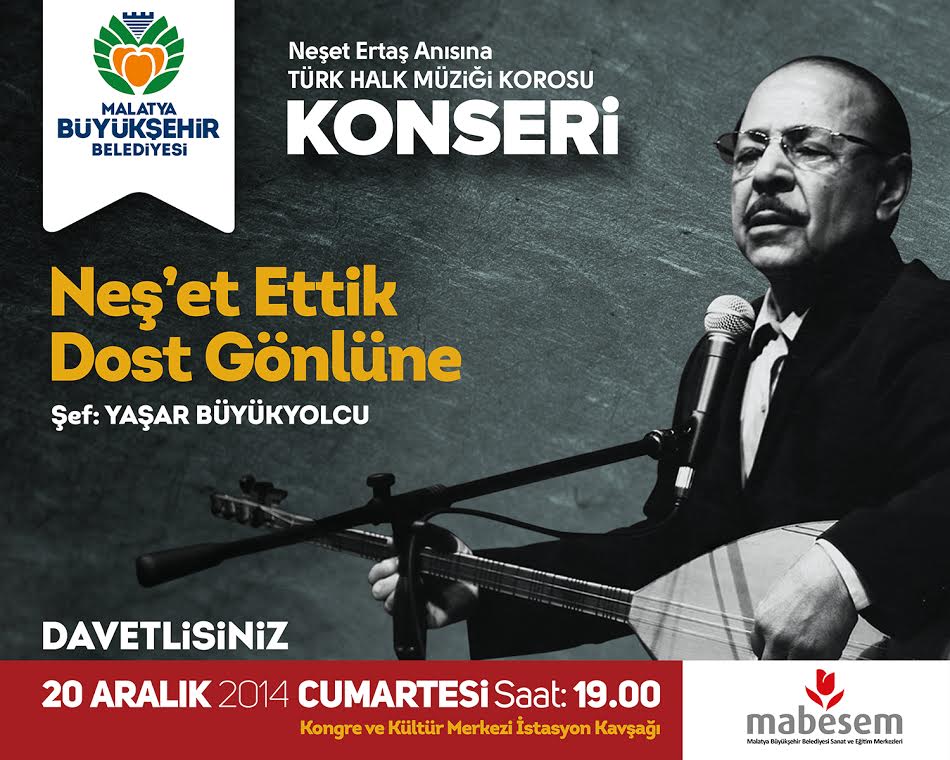 Malatya Büyükşehir Belediyesi Türk Halk Müziği (THM) Korosu, kuruluşundan bu yana geçen 1 yıl gibi kısa bir sürede 5. büyük konserini, ünlü halk ozanı Neşet Ertaş anısına düzenliyor. THM Korosu, “Neş’et Ettik Dost Gönlüne” konseriyle halk müziği dostlarına müzik ziyafeti sunacak.