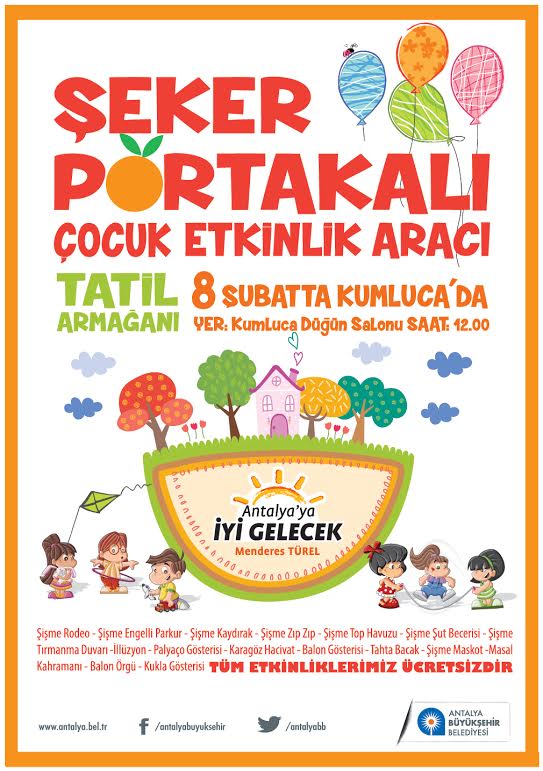 şeker portakalıAntalya Büyükşehir Belediyesi Kültür ve Sosyal İşler Daire Başkanlığı tarafından hayata geçirilen “Şeker Portakalı Çocuk Etkinlik Aracı” 8 Şubat Pazar günü saat 12.00’da Kumluca Düğün Salonu’nda çocuklarla buluşuyor.