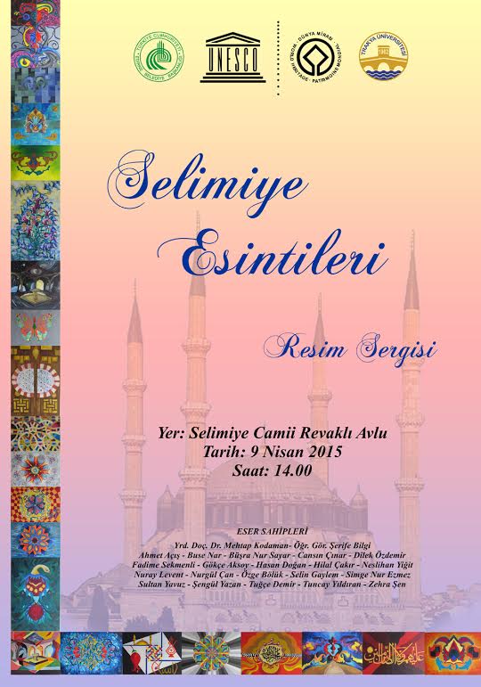 Yrd.Doç.Dr.Mehtap Kodaman-Öğr.Gör.Şerife Bilgi, Ahmet Açış, Buse Nar, Büşra Nur Sayar, Cansın Çınar, Dilek Özdemir, Fadime Sekmenli, Gökçe Aksoy, Hasan Doğan, Hilal Çakır, Neslihan Yiğit, Nuray Levent, Nurgül Çan, Özge Bölük, Selin Gaylem, Simge Nur Ezmez, Sultan Yavuz, Şengül Yazan, Tuğçe Demir, Tuncay Yıldıran, Zehra Şen’in eserlerinden oluşan sergi, 9 Nisan 2015 tarihinde saat 14.00’te, Selimiye Camii Revaklı Avlu’da açılacak.