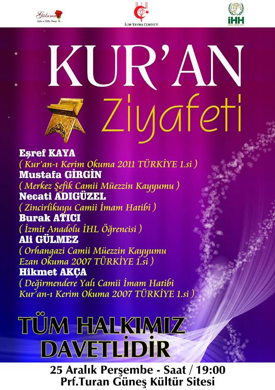 Gülsima Eğitim ve Kültür Derneği,İlim Yayma Cemiyeti Kandıra temsilciliği ve İHH ( İnsan hak ve hürriyetleri ) Kandıra temsiliği tarafından ortaklaşa düzenlenen Kur’an ziyafeti programı 25 Aralık Perşembe günü Prf. Turan Güneş Kültür sitesinde saat 19:00 da yapılacaktır.