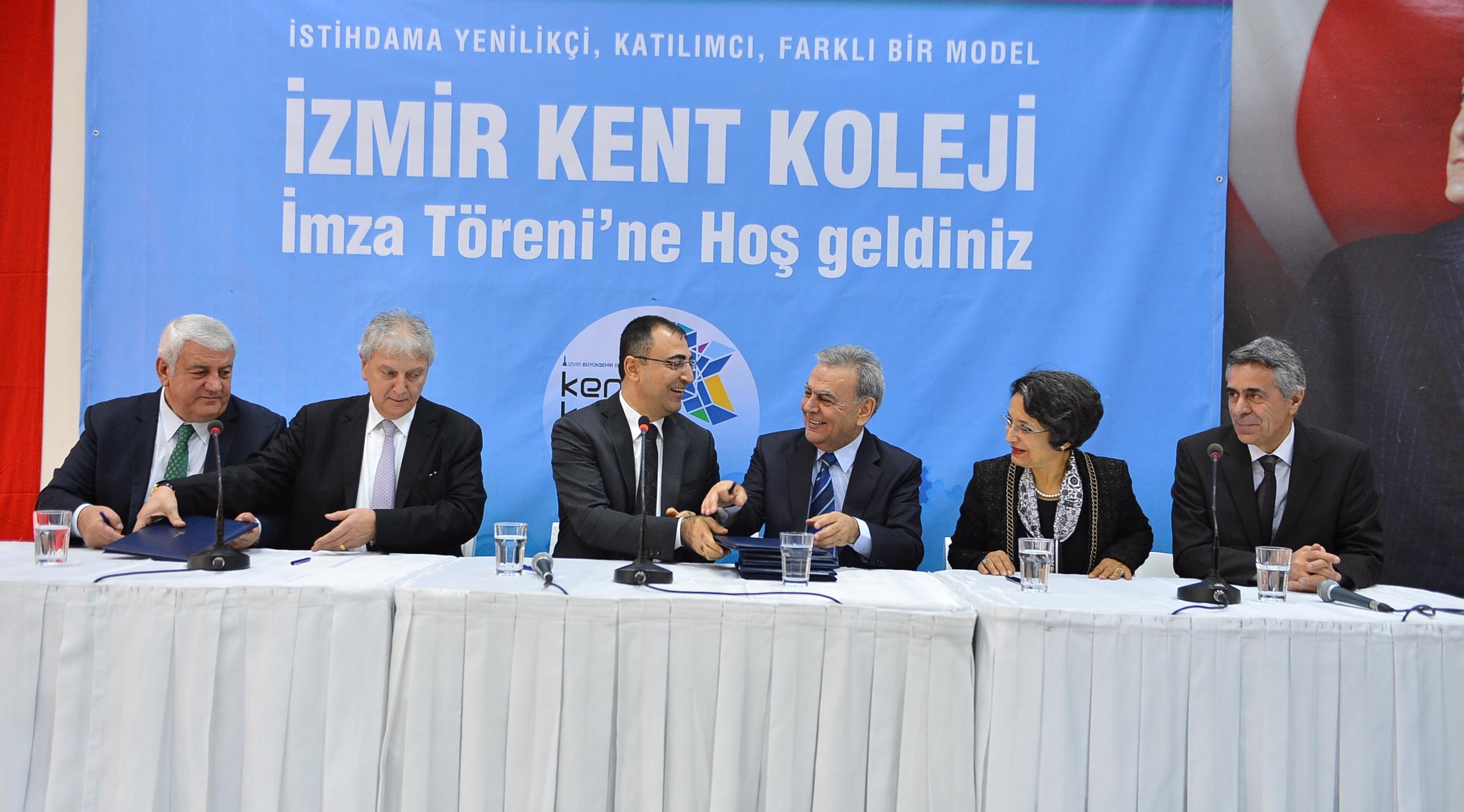 İzmir Büyükşehir Belediyesi’nin sanayi sektörünün kalifiye eleman ihtiyacını gidermeye yönelik önemli adımlarından biri olan Kent Koleji projesinde işbirliği yelpazesi her geçen büyüyor. İzmir Büyükşehir Belediyesi ve proje ortakları Yaşar Üniversitesi, Ege Üniversitesi, Ege Bölgesi Sanayi Odası ve İzmir Esnaf ve Sanatkarlar Odaları Birliği ile İzmir Kalkınma Ajansı (İZKA) arasında destek protokolü imzalandı.  Protokolü İzmir Valisi Mustafa Toprak, İzmir Büyükşehir Belediye Başkanı Aziz Kocaoğlu, Ege Üniversitesi Rektörü Prof. Dr. Candeğer Yılmaz, Yaşar Üniversitesi Rektör Yardımcısı Prof. Dr. Ali Nazım Sözer, Ege Bölgesi Sanayi Odası Yönetim Kurulu Başkanı Ender Yorgancılar ve İzmir Esnaf ve Sanatkarlar Odaları Birliği Başkanı Zekeriya Mutlu imzaladı.