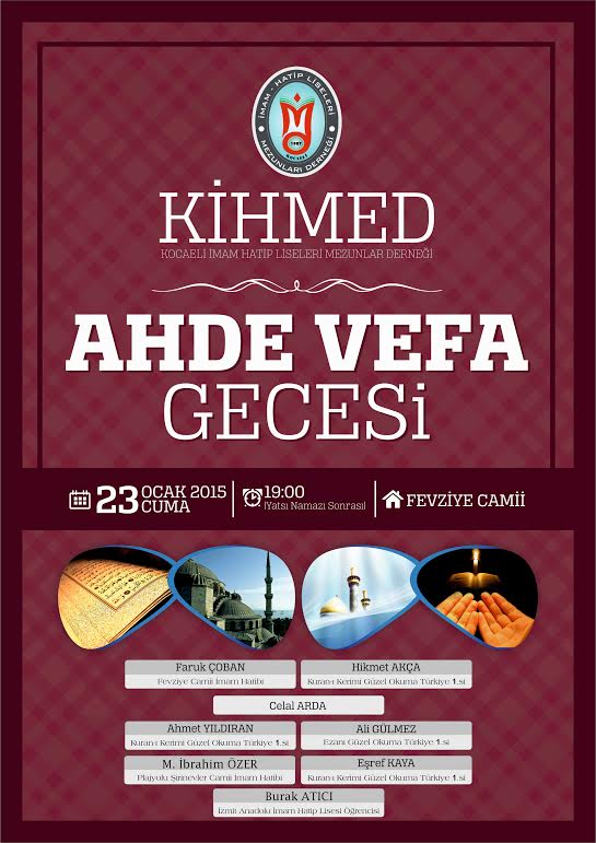kihmed1KİHMED tarafından geleneksel olarak her yıl düzenlenen, imam hatip camiasından vefat edenlerin ruhuna ithafen Kuran Kerim ziyafeti 23 Ocak Cuma günü saat:19:00 da (Yatsı Namazının sonrası) İzmit Fevziye Camiinde gerçekleştirilecek. Program ile ilgili bilgi veren KİHMED Başkanı Sabahaatin YAMAK; “KİHMED olarak Ahde Vefa’ya çok önem veriyoruz. Gelecek nesillerimize Ahde Vefa’yı anlatabilmenin önemini çok iyi biliyoruz. Bir vefa örneği olarak her yıl düzenlediğimiz programımız ile bu davaya hizmet etmiş camiamızdan vefat edenlerin ruhuna Kuranı Kerim okuyup hatırlıyoruz. Bu yıl 23 Ocak Cuma günü Yatsı namazı sonrası Fevziye camiiden gerçekleştirilecek Kuran Ziyafeti Programına Kocaeli’de Kuran-ı Kerim’i en güzel okuyan hocalarımız katılacak. Güzel kıraatleriyle Fevziye Camii İmam Hatibi Faruk ÇOBAN, İzmit İHL Mezunu Kuranı Kerimi Güzel Okuma Yarışması Türkiye 1. leri Hikmet AKÇA, Ahmet YILDIRAN, Eşref KAYA ve Ali GÜLMEZ ile İzmit İHL’nin duayen hocalarından Celal ARDA hocamız iştirak edecekler. Ayrıca Kuranı Kerimi Güzel Okuma Yarışmasına hazırlanan İmam Hatip Lisesi öğrencisi Burak ATICI öğrencimizde programımızda misafirlerimize Kuranla dolu güzel bir gece yaşatacaklar. Tüm camiamızı ve halkımızı Ahde Vefa gecemize davet ediyoruz.” ifadelerini kullandı.