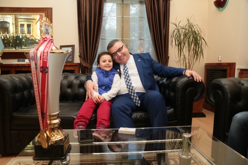 Minik şampiyon Eflin Durmaz, şampiyonada kazandığı kupa ve madalyasını Kesimoğlu’na takdim ederken, Kesimoğlu’da Eflin Durmaz ile gurur duyduklarını söyledi.