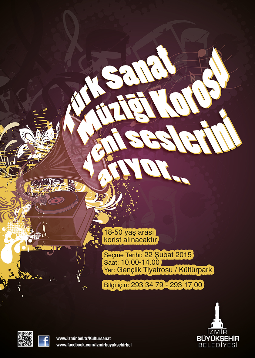 Türk Sanat Müziği  Korosu’na  18-50 yaş arasındaki korist adayları başvurabilecek. Seçmeler  22 Şubat 2015 Pazar günü saat 10.00-14.00 arası  Kültürpark  Gençlik Tiyatrosu’nda yapılacak. 2008 yılı başında yeniden yapılandırılan Türk Sanat Müziği Korusu, Şef Yavuz Karabulut yönetimindeki 50 korist ve 25 kişilik saz heyeti ile çalışmalarını sürdürüyor ve her ay İzmirli müzikseverlere ücretsiz konser veriyor.