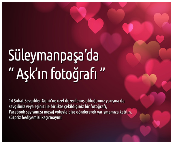 Süleymanpaşa Belediyesi 14 Şubat Sevgililer Günü için Süleymanpaşa’da Aşk’ın Fotoğrafı Yarışması’nı düzenledi. Vatandaşlar 14 Şubat Sevgililer Günü’ne özel düzenlenmiş olan yarışmaya sevgili veya eş ile birlikte çekilen bir fotoğrafla katılabilecekler. Vatandaşlar çektikleri fotoğrafları Facebook üzerinden Belediye sayfasına mesaj yoluyla göndererek yarışamaya katılabilecek. Yarışma sonunda dereceye giren ilk üç fotoğraf sahibini sürpriz hediyeler bekliyor.