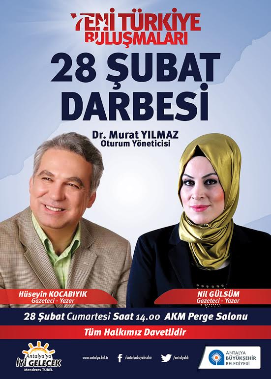 Antalya Büyükşehir Belediyesi Kültür ve Sosyal İşler Dairesi Başkanlığı’nca organize edilen ‘Yeni Türkiye Buluşmaları’ konferanslar dizisinin 13’üncüsü, 28 Şubat Cumartesi günü saat 14.00’de Antalya Kültür Merkezi (AKM) Perge Salonu’nda gerçekleşecek. 18’inci yıl dönümünde ‘28 Şubat Darbesi’nin tartışılacağı konferansta, Gazeteci-Yazar Hüseyin Kocabıyık ve Nil Gülsüm konuk olacak. 28 Şubat Darbesi’nin bütün yönleriyle masaya yatırılacağı konferansa tüm Antalyalılar davetli.
