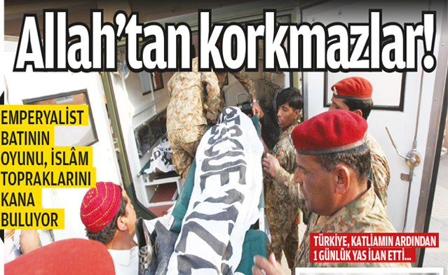 Pakistan’ın Peşaver kentinde silahlı saldırganlar askeri okula girerek 500 öğrenciyi ve öğretmenleri rehin aldı. Çıkan çatışmada en az 130 öğrenci ve güvenlik görevlisi öldü, 122 kişi de yaralandı. İslâm’ı ve Müslümanları karalamak isteyen emperyalistlerin oyununa gelenlerin çatışmasında olan zavallı çocuklara oldu! Rehin alınan masum çocuklardan 130’u çatışmalarda şehit oldu…