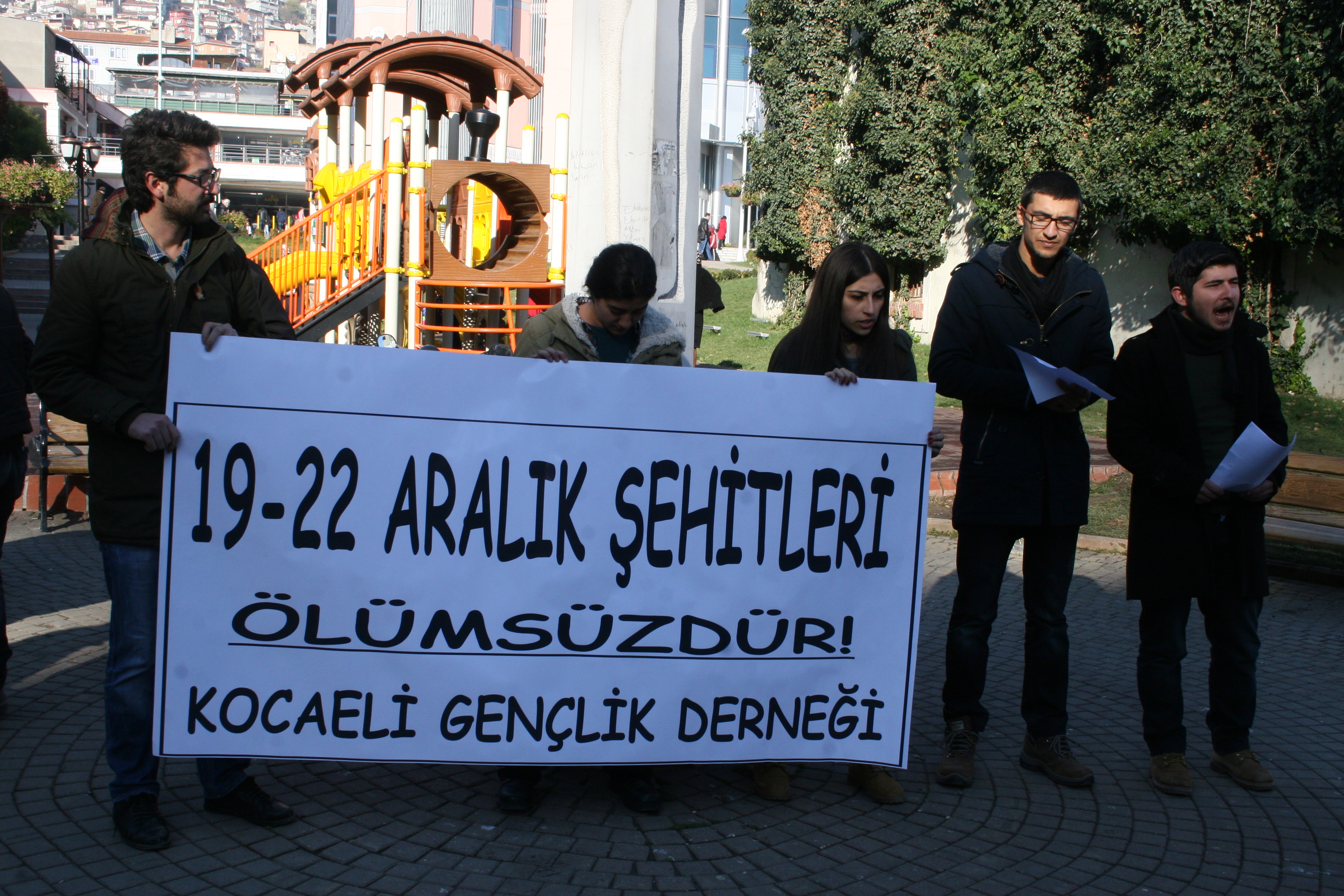 İzmit’teki Sabri Yalım Parkı’nda Dev-Genç üyeleri adına basın açıklaması yapan Uğur Budak, 20 hapishaneye ‘’hayata dönüş’’ adıyla yapılan eş zamanlı operasyonu katliam olarak nitelendirip, ‘’28 devrimci tutsak diri diri yakılarak katledildi’’ dedi. Budak, 20 Ekim 2000 tarihinde başlatılan ölüm orucu direnişini de anımsatarak, ‘’Bu direniş, 22 Ocak 2007’de 122 şehitle zafer kazandı. Şehitler, dünyada en uzun ölüm orucunu gerçekleştirerek yeni gelenekler bıraktı. 19-22 Aralık’taki direnişin sahibi devrimciler F tiplerinde de yeni gelenekler yaratmaya devam ediyor. Tecrit hücrelerine atılan özgür tutsakların bugün başlarının dik olduğunu, o hücrelere teslim olmamak için direnerek ürettikleri ürünlerde görüyoruz’’ diye konuştu.