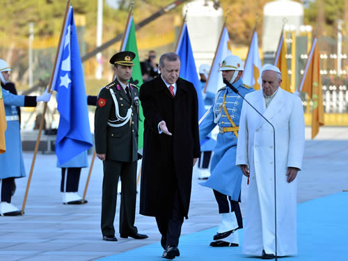 Cumhurbaşkanlığı Sarayı’na gelişinde Vatikan Devlet Başkanı Papa Fransuva’ya Kara Kuvvetleri Süvari Birliği eşlik etti. Gerçekleştirilen karşılama töreninin ardından Cumhurbaşkanı Erdoğan ve Papa Fransuva baş başa görüşmeye geçti.