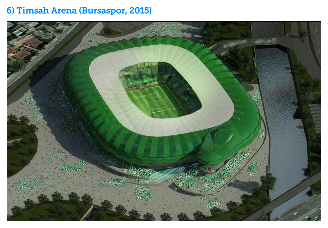 İngiltere’nin yüksek tirajlı The Telegraph gazetesinin editörü Adam Hurrey, dünya genelinde inşaatı devam eden dev stat projelerini araştırdı. Stadyumların ekonomik boyutları ve kente katacağı değerleri ele alan Hurrey, dünyanın en heyecan verici 10 projesini kaleme aldı. Hurrey’in araştırmasında Türkiye’den de Bursa Büyükşehir Belediyesi tarafından yaptırılan yeni stadyum, heyecan verici projeler arasında gösterildi. Hurrey, inşaatı devan eden heyecan verici projelerin bitiş tarihlerini de kaleme aldığı liste şöyle oluştu: “Estadio La Peineta (Atletico Madrid, 2017), Baku National Stadium (Azerbaijan, 2015), Zenit Arena (Zenit Saint Petersburg, 2016), Stade des Lumières (Lyon, 2015), Allianz Parque (Palmeiras, 2014), Timsah Arena (Bursaspor, 2015), Nouveau Stade de Bordeaux (2015), CSKA Moscow Stadium (2015), New Ferenc Puskas Stadium (Budapest, 2018), Al Wakrah Stadium (Qatar, 2022)”
