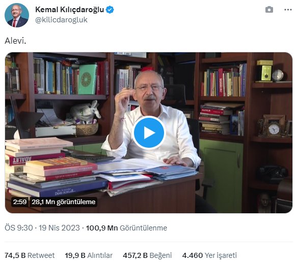 CHP Genel Başkanı Kemal Kılıçdaroğlu’nun 3 gün önce Twitter hesabından “Alevi” notuyla paylaştığı video paylaşımı 100 milyon görüntülenmeyi geçti.