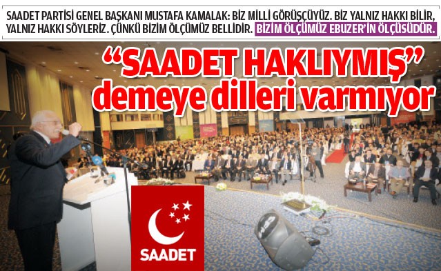 “Milli Görüş politikalarına dönülmedikçe, ne ekonomi düzelir, ne yolsuzluklar önlenir, ne de halkımız huzur ve refaha kavuşur. Çünkü bu işler lafla değil inançla olur. Şimdilerde; yeni bir laf doladılar ağızlarına. Ne diyorlar, “Yeni Türkiye” Hemen peşinen söyleyeyim ki; Birincisi, öyle yeni demekle yeni olunmaz. İkincisi, biz Yeni Türkiye’nin değil, Yeniden Büyük Türkiye’nin mücadelesini veriyoruz. Peki neden Yeniden Büyük Türkiye? Batıya uyduluk değil, İslam dünyasına öncülük yapmak için Yeniden Büyük Türkiye’! Zalimlere payanda olmak için değil mazlumlara rehber olmak için Yeniden Büyük Türkiye! BOP’a eşbaşkanlık yapmak için değil, adil bir düzen kurmak için Yeniden Büyük Türkiye! Avrupa Birliği kapılarında oyalanmak için değil, İslam Birliği’ni kurmak için Yeniden Büyük Türkiye! Bunu ancak biz yaparız. Milli Görüşçüler yapar. Saadet Partisi yapar. Çünkü Saadet Partisi, diğer partilerden biri değildir. Saadet Partisi, partilerin değil, bu bozuk düzenin, bu adaletsiz sistemin alternatifidir Saadet Partililer, bu düzene bekçi olmaya değil, bu düzenin yerine Adil Bir Düzen kurmaya geliyor. Bu yüzden Saadet Partisi Türkiye için bir tercih değil bir zorunluluktur.”